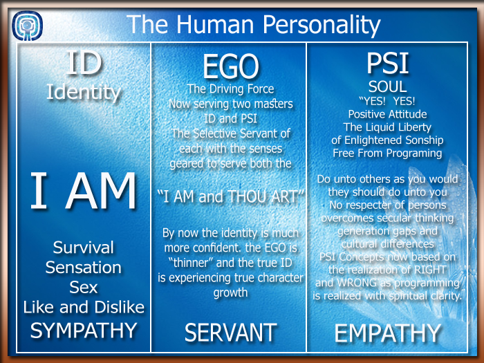 The "ID" part of us doesn't have to worry, it will always be personal to us. But by now it is more confident .... "fatter" if you like. Ego doesn't have to spend so much time catering to it, and so is freer to serve two masters - the ID and the PSI. Loliad's version of the human personality is our goal. Getting all components of our personality working in harmony results in a solid, strong identity with lots of drive, governed by the highest aspect of our being. Emotional power, happiness and meaning to life are the benefits.